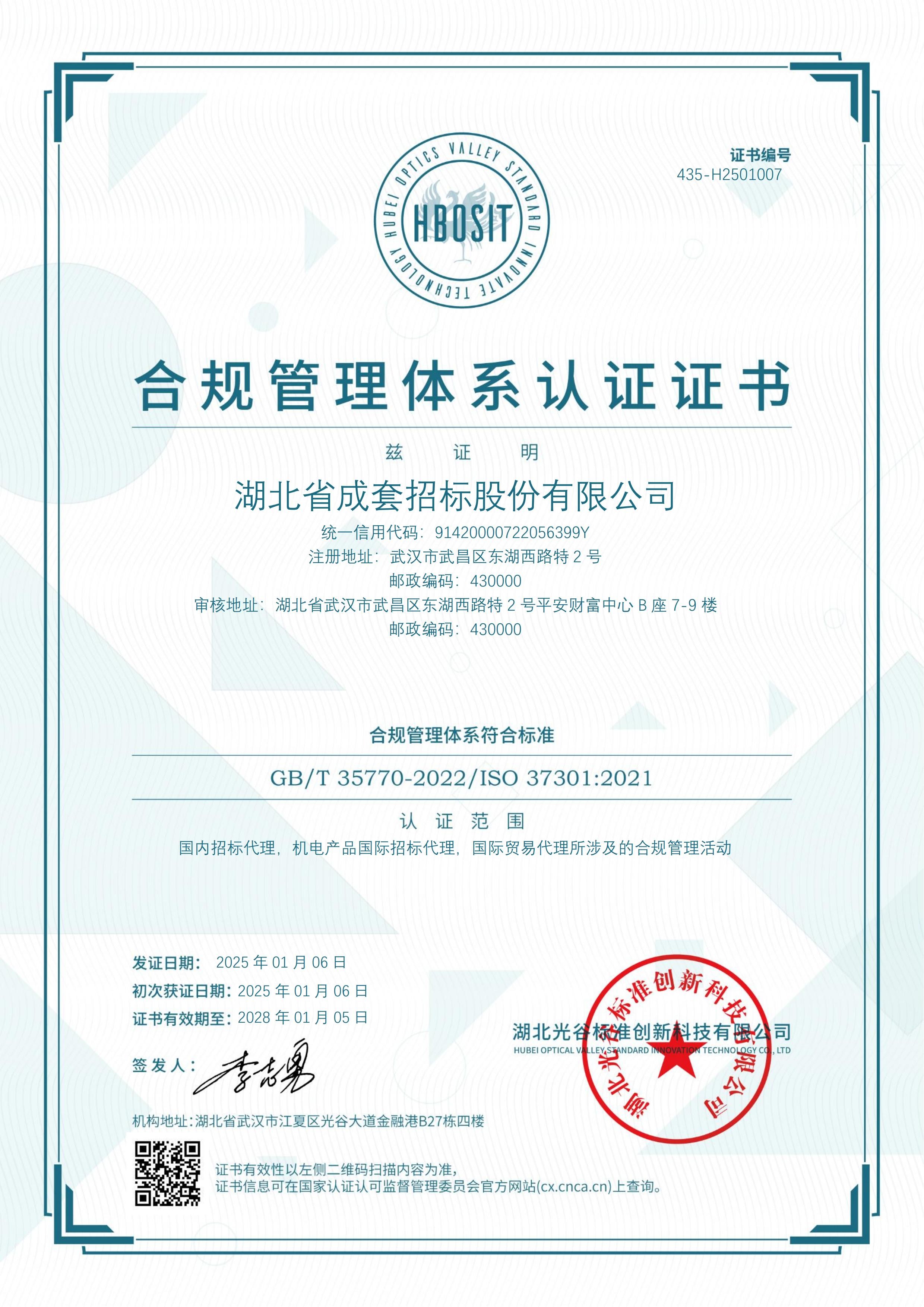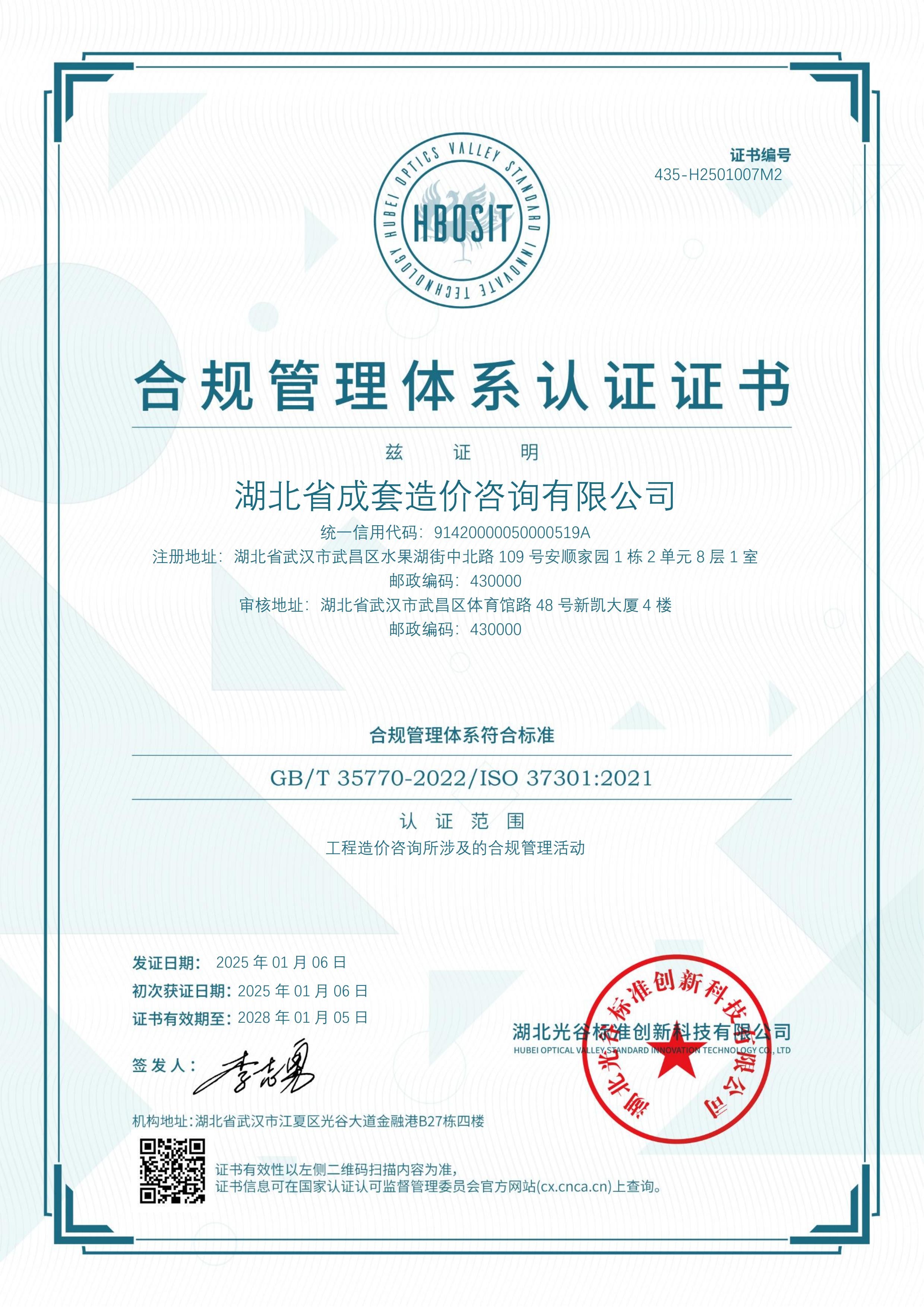 湖北省成套造价咨询有限公司合规管理体系认证证书