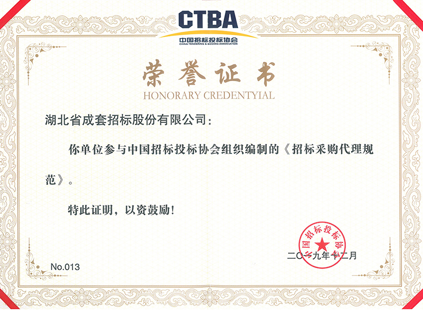 公司积极参与《招标采购代理规范》的编制工作,受到中招协表彰